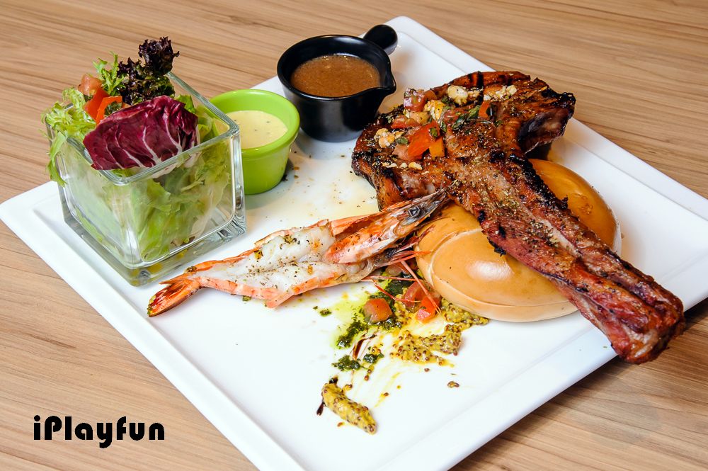 ►戰斧豬排(售價580元),有超大豬肋排搭配鮮蝦、貝果跟沙拉,分量超大。醬料為蜂蜜芥末醬與紅酒醬,搭配豬排吃各有風味