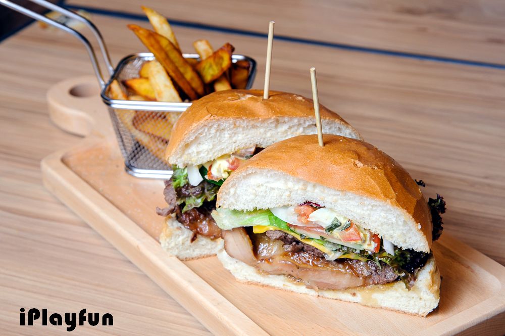 ►大能量系列的大漢堡麵包(售價280元),這款式共有三種麵包可選,分別為漢堡麵包、雜糧麵包、墨魚麵包跟牛角麵包。內餡為雞排與漢堡肉,加上水煮蛋、洋蔥、番茄等。配菜為洋芋與番薯二合一個薯條籃,酥脆美味