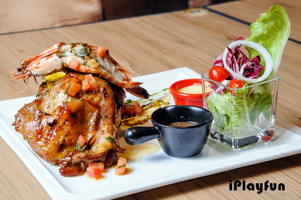 ►鴛鴦烤雞排(雙醬)售價320元,現烤雞排搭上鮮蝦,醬料口味細緻豐富,搭配清爽沙拉