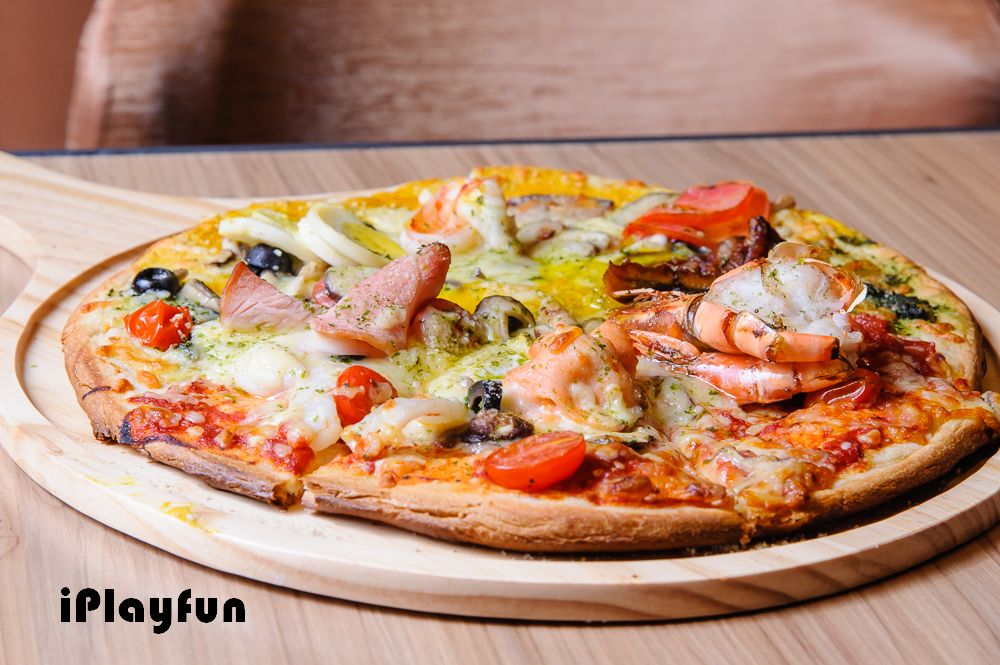 ►九宮格比薩(售價380元) 此款小編大推薦,使用九種配料包括蝦、花枝、雞翅、鰻魚等,份量超大
