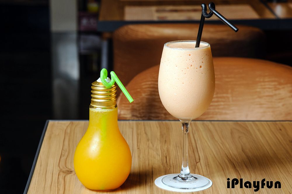 ►單點現榨果汁(售價120元)左為燈泡果汁,內裝柳橙西柚汁、右為蜂蜜木瓜汁