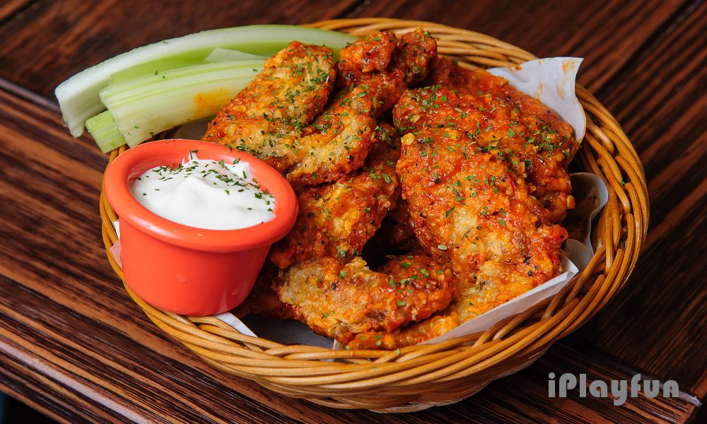 新鮮雞翅醃漬入味後,先烘烤再油炸,外層裹上特製的蜂蜜辣椒醬,旁邊搭配新鮮翠綠的西芹棒佐酸奶醬。雞翅經過精心烹調,雞骨已與雞肉分離,外脆內嫩,十分多汁。香辣的口感搭著清爽的西芹一起吃,酸奶醬更是特別對味。