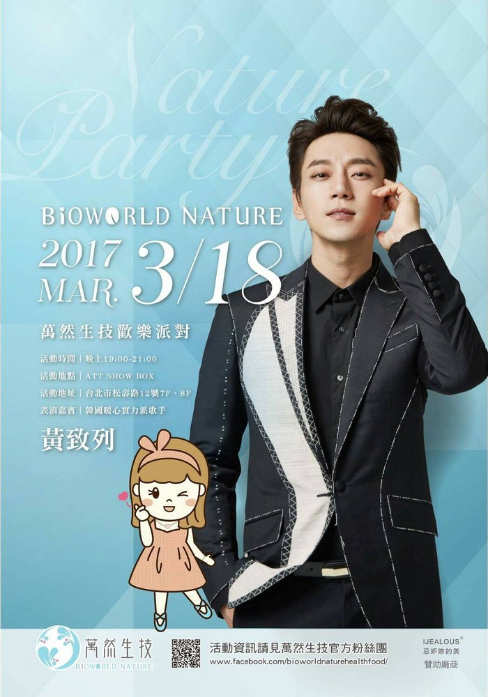 「萬然生技」公司相關產品,自本年1月起正式在全省屈臣氏上架後,獲得消費大眾廣大迴響,為感謝民眾支持與信任,該公司將於3/18邀請韓國當紅歌手黃致列來台演唱與民眾同歡。萬然生技創辦人吳紹瑜表示,黃致列在韓國參與並推廣公益活動不遺餘力,此次特地選在他出道10週年的同時,邀請他到台灣勵志開唱,用他成名前經過9年沉潛的心路歷程,鼓勵時下年輕朋友。