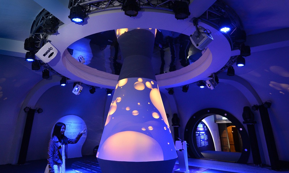 大會主題區熔岩脈動空間,透過Optoma光影交織的環景呈現,將體驗者包覆在如宇宙空間,探索空間、物質、能量和時間的變化。以5台超過5000流明的短焦寛螢幕投影機W505融合拼接而成的錐型熔岩燈,藉由自然循環的反覆意象來詮釋動態平衡的理念,而點選技術的體驗行為會影響熔岩燈的狀態,分子泡泡將進行顏色、型態的變化。
