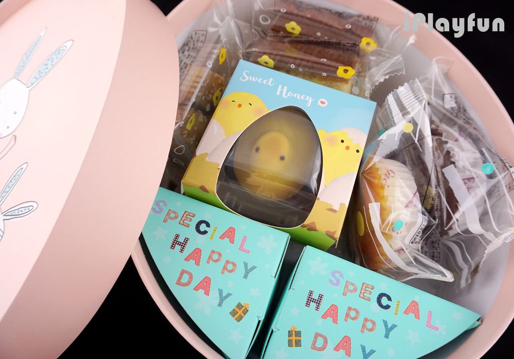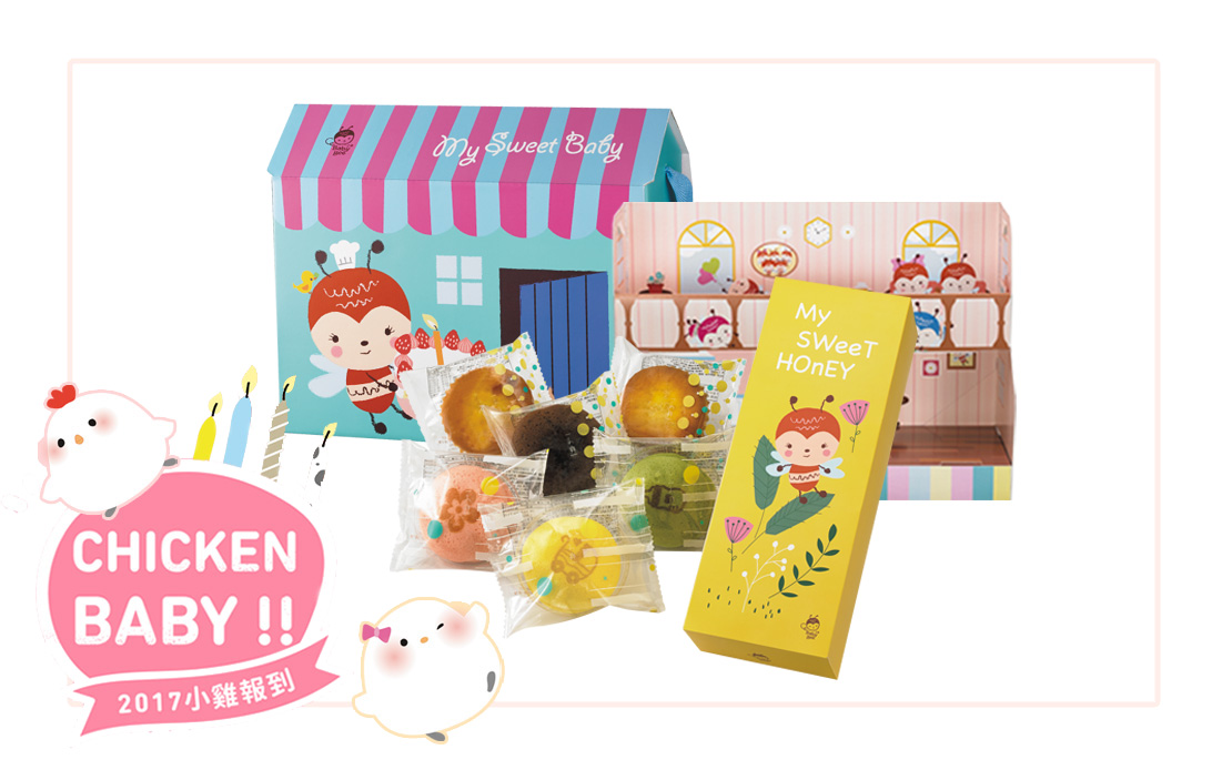 小雞誕生配合小雞主題,於點心之中特別安排一款小雞造型的小點心畫龍點睛,收到禮盒就收到滿滿的心意與新生命誕生的喜悅。除了包裝可愛童趣之外,盒裝組合點心豐富,包括龍眼蜜蜂蜜蛋糕、前文提到的小雞寶貝點心、巧心酥、磅磅蛋糕(起士與巧克力兩種口味)、蜂蜜QQ糖、四季果露等,另外還貼心的附上錫蘭紅茶包,搭配點心更加順口溫潤。
