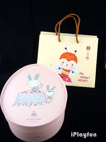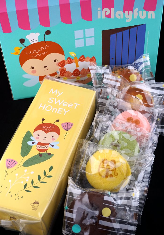 盒裝點心包括招牌龍眼花蜜蜂蜜蛋糕、充滿奶香的磅磅蛋糕,而最具有特色的是水蒸式小蒸菓,造型像是馬卡龍,但是更為溫潤的糕體口感,每個小蒸菓烙印上超可愛奶瓶、娃娃車等北鼻週邊產品的圖樣,美味又童趣。盒內的點心食畢後,小蜜蜂造型的樓中樓造型外紙盒還可當作整理盒使用,大小適中,收納文具、化妝品等小物方便又環保。