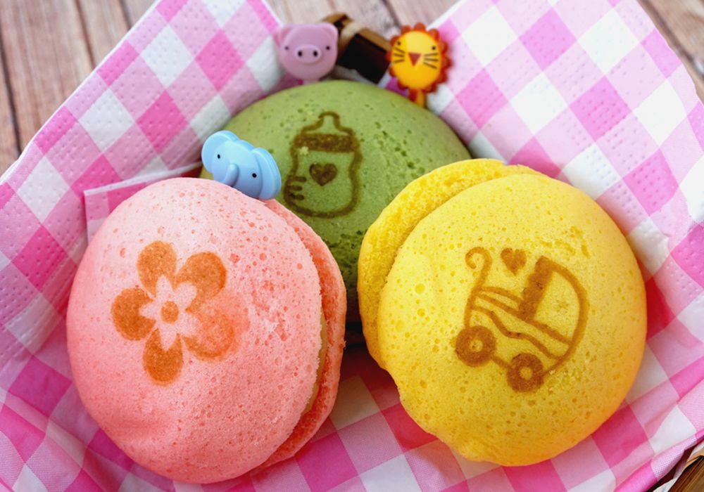 ►水蒸式小蒸菓造型像馬卡龍,烙印奶瓶、娃娃車等北鼻週邊產品的圖樣,美味又童趣(實品不含擺飾物)