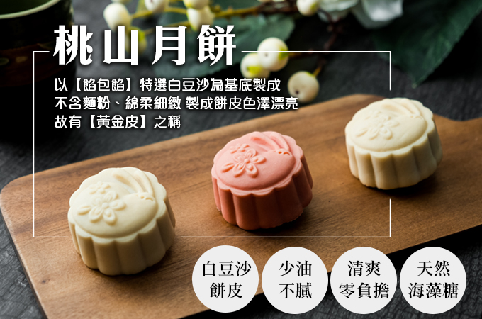 ►桃山月餅以白豆沙取代麵粉餅皮,有香柚玉兔與白木耳兩種健康口味