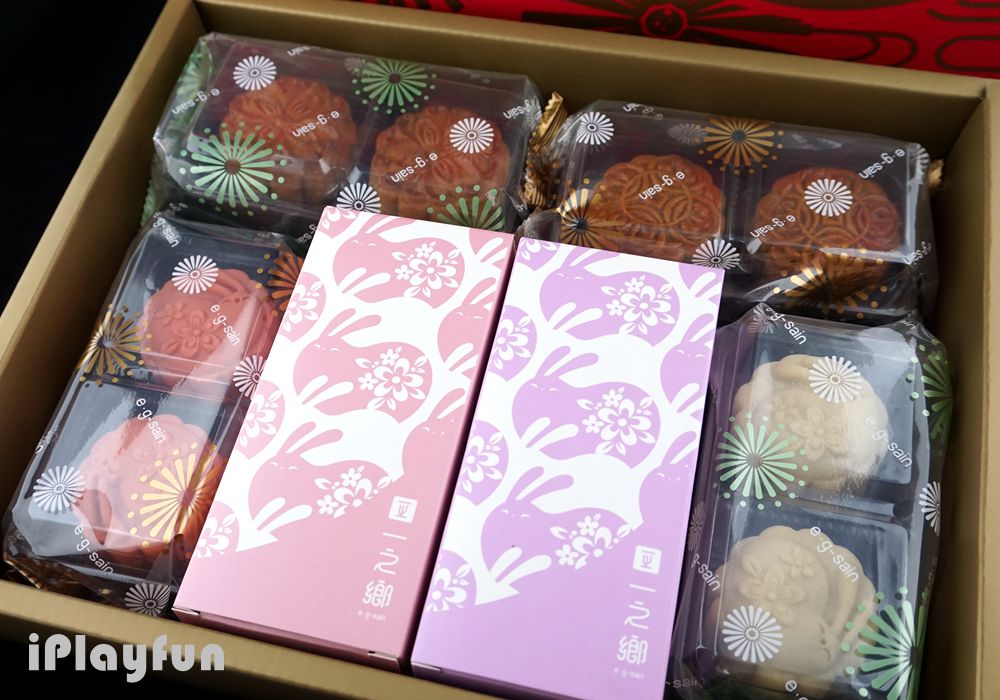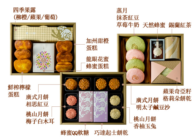 盒裝有三層,內容極為奢華豐富,蛋糕部分有龍眼花蜜蜂蜜蛋糕、鮮榨檸檬蛋糕、加州甜橙蛋糕三種口味,月餅則分為桃山月餅、廣式月餅兩種類型。桃山月餅有梅子白木耳與香柚玉兔兩種創意口味,廣式月餅則為明太子鹹豆沙與相思紅豆兩種,口味都非常特殊、有別於傳統的固定口味。
