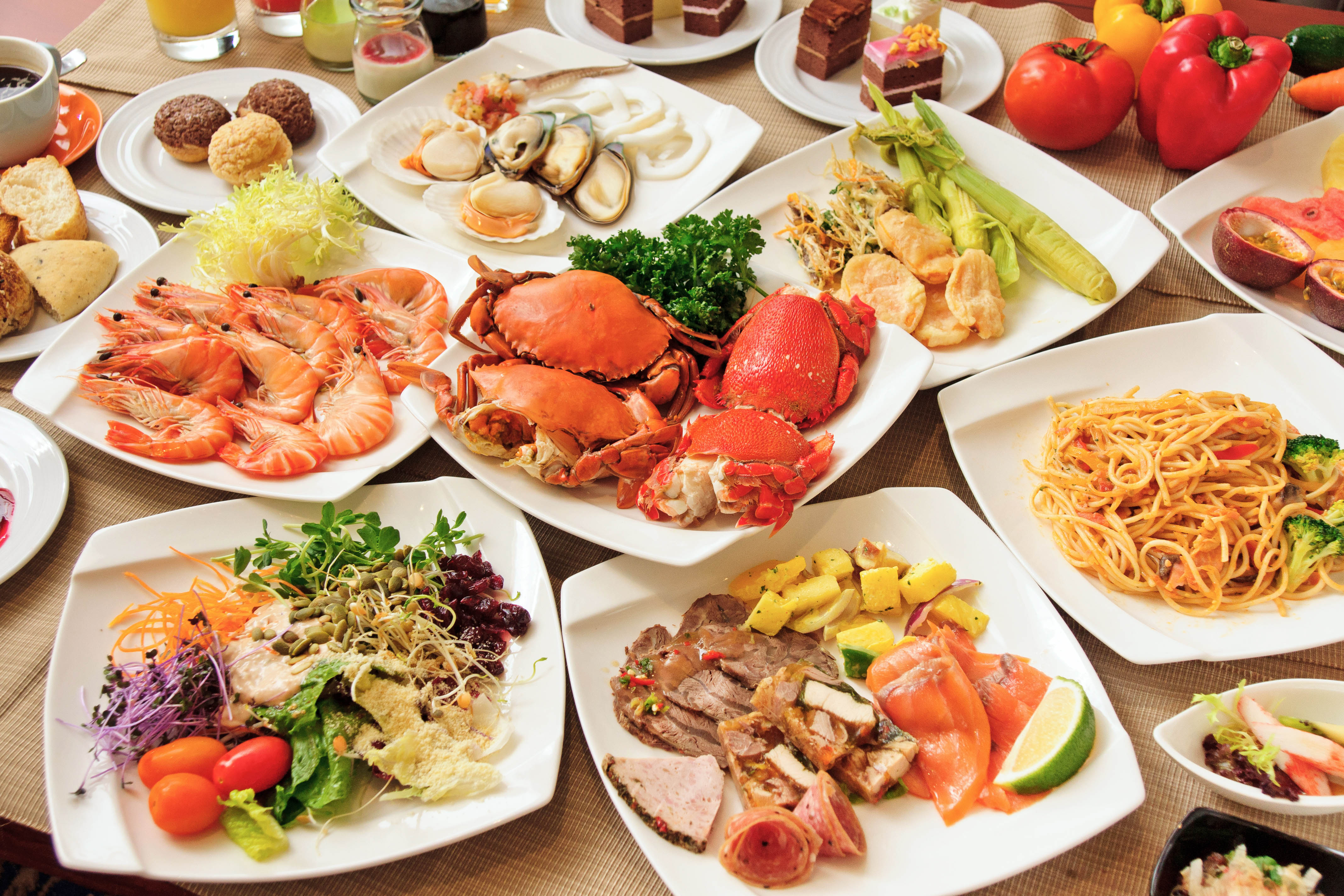 - 現切燒烤美國肋眼牛排、焗烤加拿大鮮蠔/日式照燒芝麻雞腿/德國豬腳/酥炸軟殼蟹/北海道干貝佐芒果蛋黃醬(位上服務)/XO醬海鮮炒飯/挪威煙燻鮭魚/龍蝦海鮮湯/各式精緻甜點飲料等。
