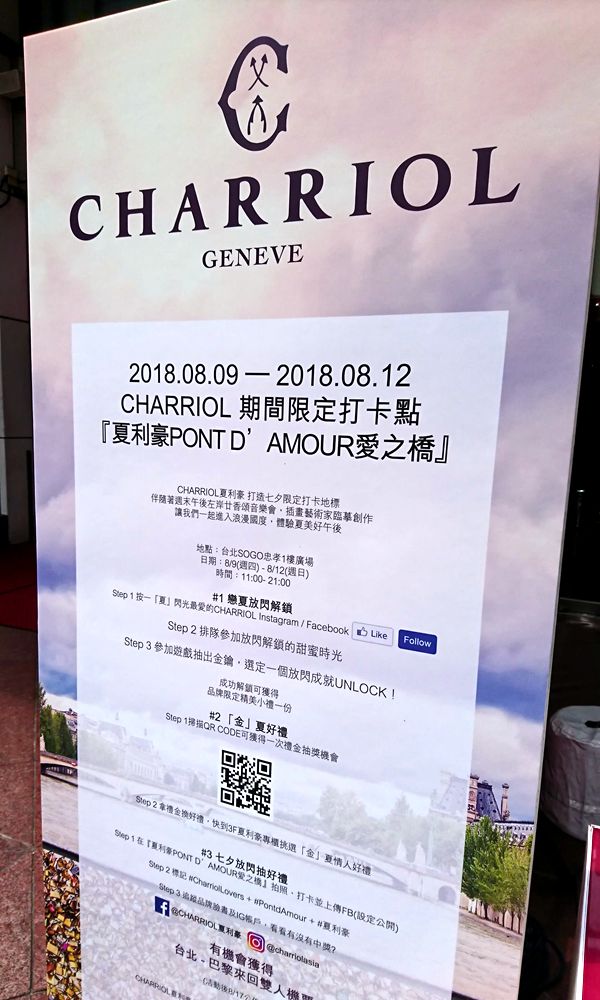 瑞士精品品牌Charriol夏利豪在今年夏季舉辦愛之橋浪漫情人節活動,以法式情人橋為題, 法文 “PONT D'AMOUR” 意思為「愛之橋」,PONT D'AMOUR手環代表的不僅是情侶永結同心,忠貞不二的承諾,也象徵著不同個性的兩個精神個體接受且包容的浪漫愛情。