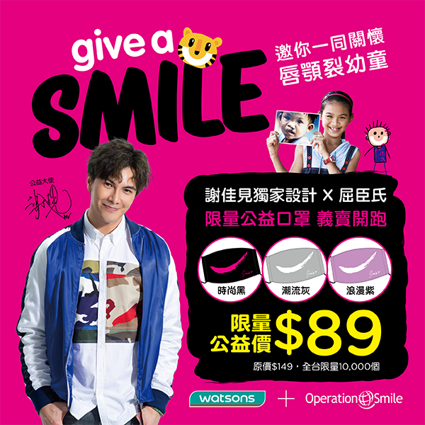 「Operation Smile微笑行動」是致力於為全球貧困地區患有唇顎裂兒童提供免費手術與相關治療的非營利性公益組織,30多年來在全球已經為超過27萬名患者提供免費唇顎裂修復手術。屈臣氏X公益大使謝佳見獨家設計限量公益口罩即日起於全台屈臣氏門市及屈臣氏網路商店獨家販售,共有3款顏色(時尚黑、潮流灰、浪漫紫),公益價89元,全台限量10,000個,每賣出一個口罩,屈臣氏將捐出新台幣20元給「Operation Smile微笑行動」,總計將募集新台幣20萬元公益善款,幫助更多唇顎裂幼童進行顏面矯正手術。