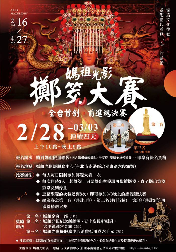 欣逢己亥豬年228的四天連續假期(2/28-3/3)大甲媽祖駐駕在台北南港區忠孝東路6段39號(玉成新創中心)供信眾參拜,主辦單位特別在連假間舉辦全民擲聖茭的活動,在這四天的連續假期中只要報名參加擲茭大賽,連續擲出八個聖茭者,就有機會把黃金媽祖金身請回家,這尊黃金媽祖金身只有在大甲鎮瀾宮的新年搶頭香活動中才有機會能恭請回家。其他二獎和三獎也是極為難得的精選大獎,有限量媽祖北巡紀念祈福酒及天上聖母祈福扇和鎮瀾宮的令旗等及媽祖光影文創展商品抵用券價值6000元等,就是要讓每一位親臨參與的信眾都能感受大甲媽祖的加持和祈福,平安開運迎發財、心想事成求好彩頭。