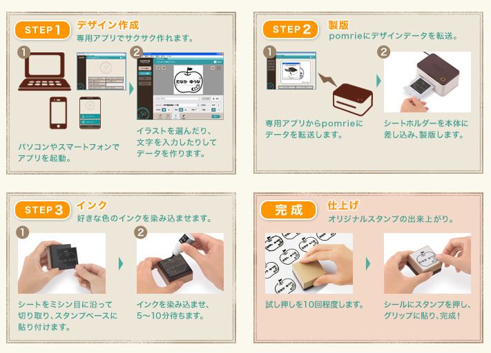 Casio日本推出一系列名為Pomrie的stamp maker(印章製作器),可以簡單地透過幾個步驟,快速做出自己喜歡的印章,讓大家可以在任何地方創意使用自己喜歡的圖樣。製作方式很簡單,只要先選定自己喜歡的圖或照片(有支援多種圖片格式),將圖片傳到機器上,之後利用這款機器專用的圖章材料,就會自動刻出圖章的橡皮面。其後再搭配專用的印章柄黏貼好,就變成你專有的印章了。