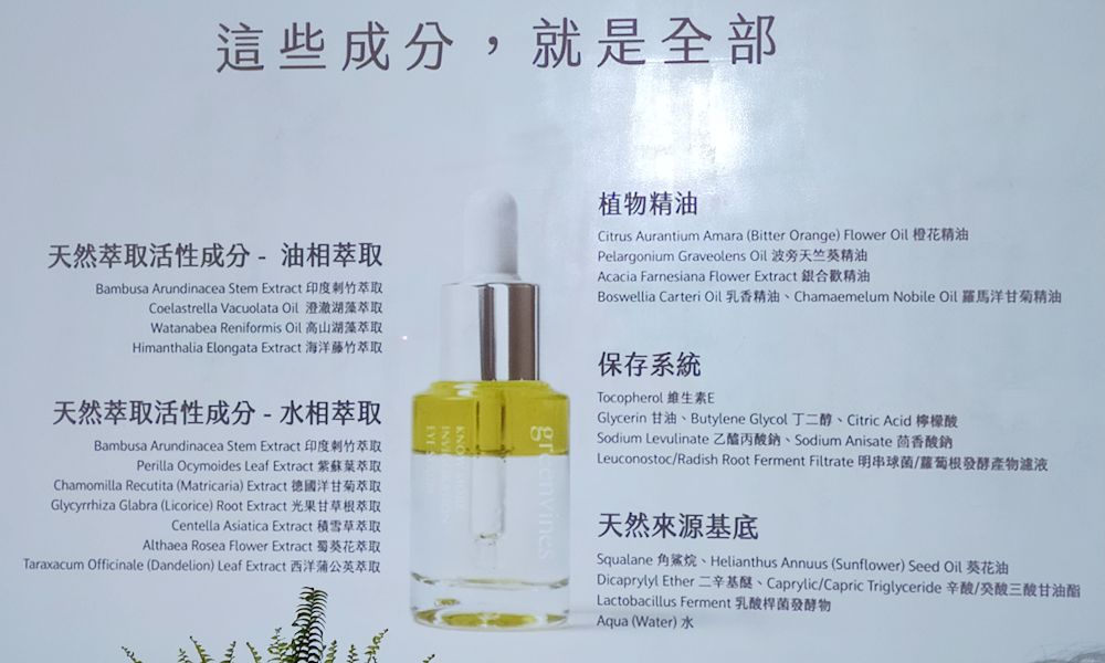 而在下層透明的水相精華中,取代純水做為整瓶精華液基底的,是實證有效提升肌膚含水量 30% 的印度刺竹發酵萃取物,而集結紫蘇葉、德國洋甘菊、光果甘草根、積雪草、蜀葵花、西洋蒲公英與三七草等七種舒緩修護功能草本的「專利修護七方」。
