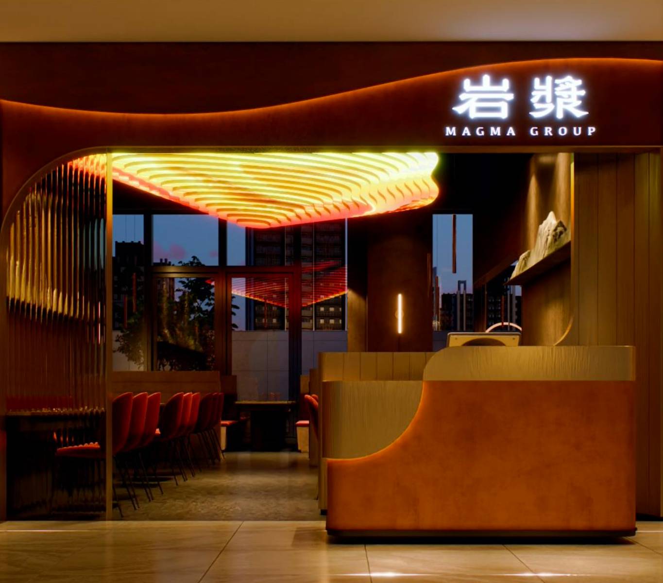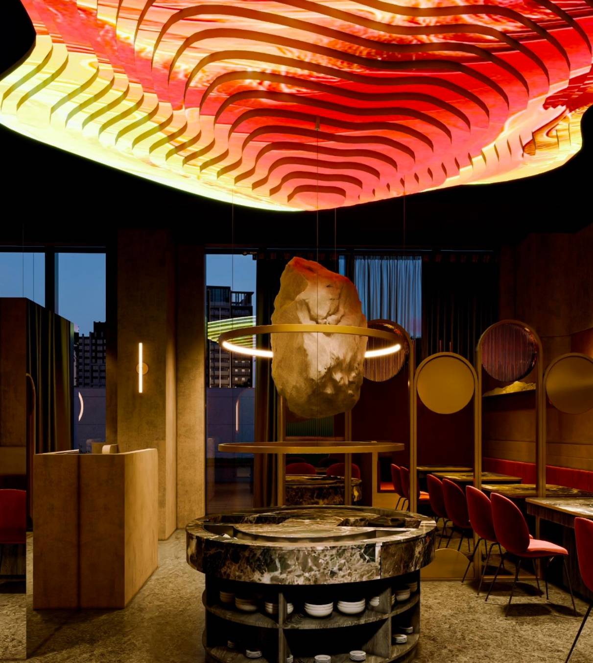 仰視頭頂有如山脈等高線的倒掛設計,透過光影投影技術創造出千變萬化的畫面,色彩的交融,更是一場光影的舞蹈。每一個細微的變化都是對空間的一次重新塑造,身臨其境的感官之旅。