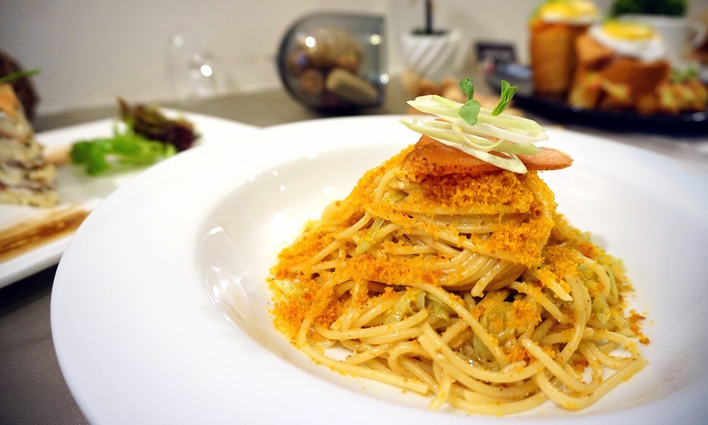►黃金烏魚子義大利麵,精心挑選烏魚子的品質與來源,採用台灣屏東烏魚子,而在精準的時刻入鍋與義大利麵拌炒