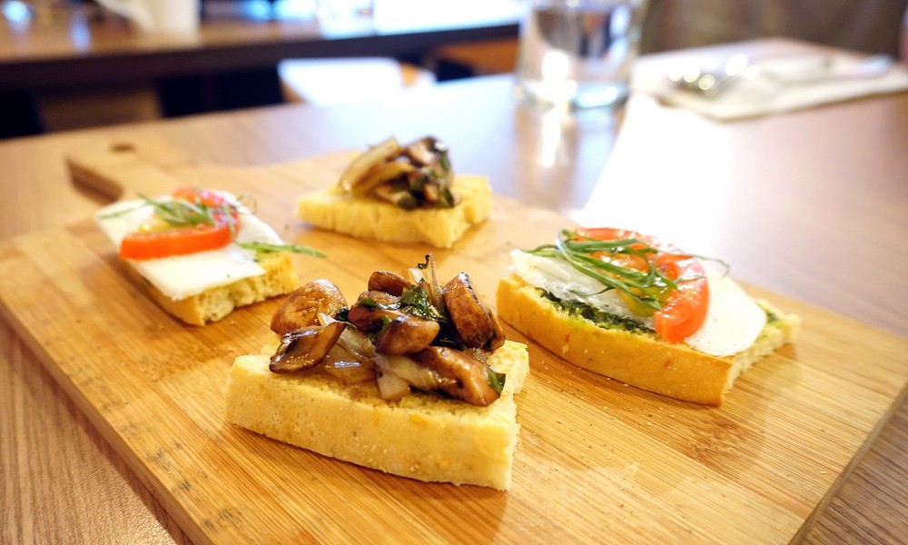 ►開胃麵包有兩種,一種是磨菇口味,一種是番茄羅勒搭配水牛乳酪,建議配橄欖油食用