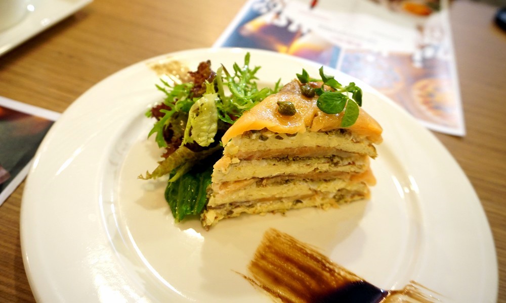 ►鮭魚千層蛋糕讓煙燻鮭魚與蛋層層疊起,並加入酸豆搭配,切成扇形,突顯層次