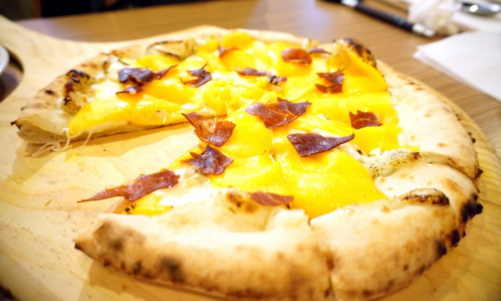 ►芒果PIZZA以薄芒果片鋪在表面,再撒上火腿跟起司烘烤