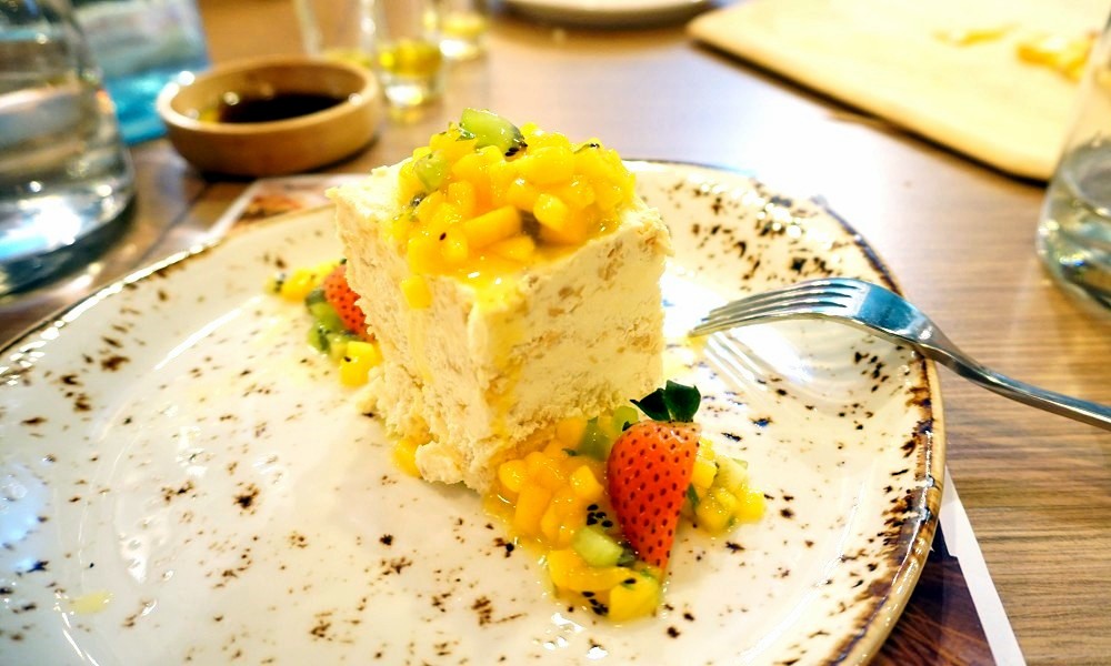 話說一頓飯一定要有甜點畫上美好句點,寶妮吃到的甜點很特別一個是芒果PIZZA,一個是芒果杏仁霜。芒果PIZZA就是以很薄的芒果片鋪在表面,再撒上火腿跟起司烘烤,吃起來口味非常溫和,熱熱吃軟Q好吃,強力推薦。杏仁霜則是用杏仁果磨碎搭配用蛋白霜、鮮奶油做成塊狀,上面灑滿含小塊果肉的芒果醬,吃起來口感層次很多!