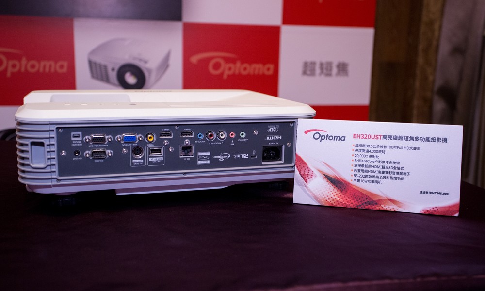 Full HD超短焦投影機EH320UST,最短投距只要30.5公分可投影100吋的大畫面,解析度為1920x1080,光輸出強度達4000流明,20000:1高對比,結合新一代的BrilliantColorTM影像增色技術。內建16W大功率喇叭,即使沒有安裝外接喇叭,也能享有音響效果。此外,亦提供RS232搭配投影機ID辨識功能與內建LAN網路控制功能,藉由 RJ45 網路線即可從電腦端控制投影機,甚至多台投影機。EH320UST建議售價為65,800元。
