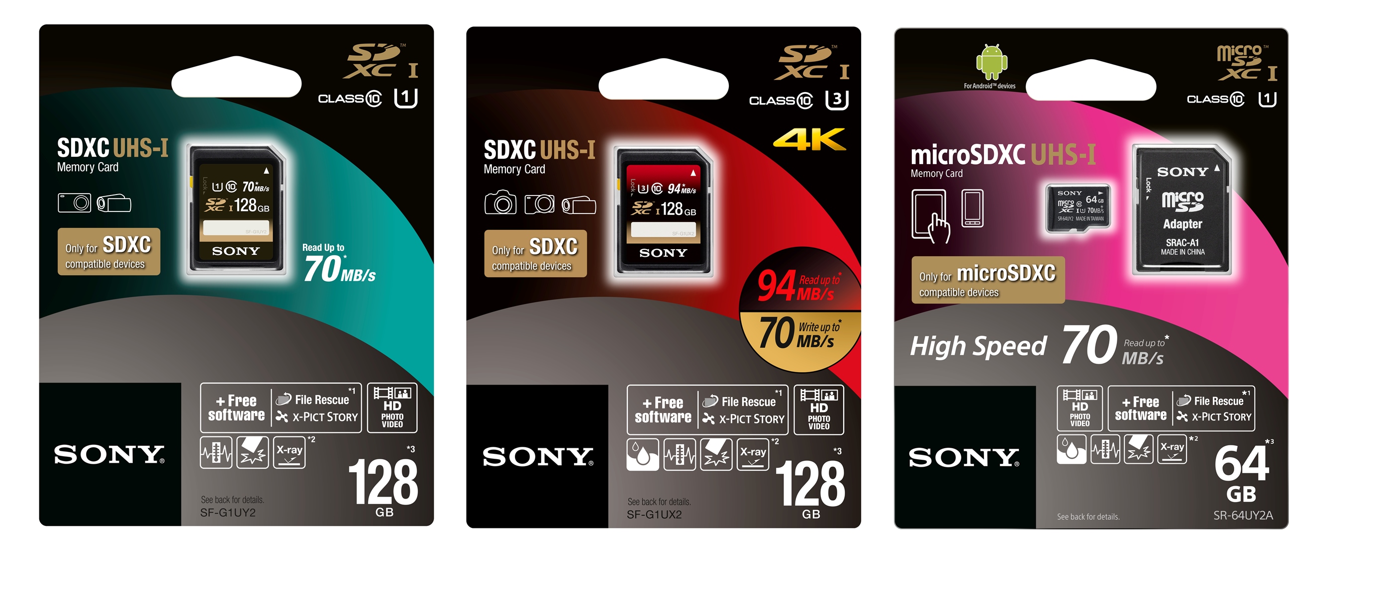 Sony在台推出三款高速SD及Micro SD存取記憶卡,針對目前消費者使用數位相機及行動裝置大量的拍照需求,提供至少70MB/s以上的讀取速度,兩款SD 存取記憶卡【SF-UY2】、【SF-UX2/T2】 皆提供高達128G的大容量選擇,其中具備最高可達94MB/s讀取速度的【SF-UX2/T2】系列,對應UHS-I Class 3 (U3)的儲存速度規格,支援單眼相機高速連拍以及4K影像拍攝,可存取大量資料,捕捉高品質畫面更加得心應手;而同樣可支援拍攝Full HD影片的【SR-UY2A】系列,針對智慧型手機使用者擴充容量或是追求高速效能的需求。