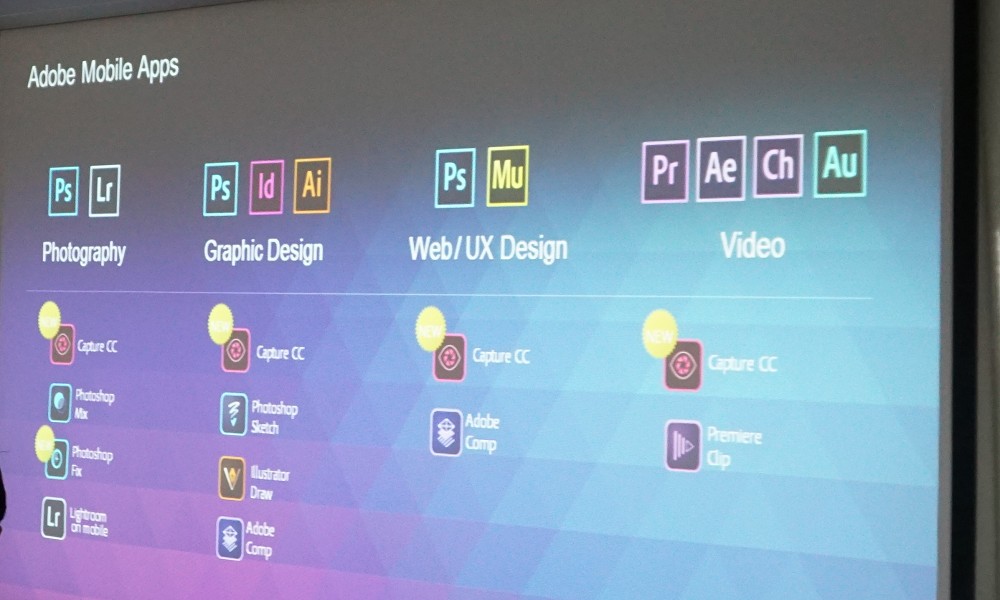 Adobe推出兩個行動App Photoshop Fix 和 Capture CC,能快速的修圖。Adobe也公布了橫跨Creative Cloud桌面應用程式的最新觸控功能,包含Photoshop CC、 Illustrator CC 及 Premiere Pro CC。今年Adobe MAX特別強調獨家專利CreativeSync技術 , 能夠強化桌面應用程式、行動App、和創意工作者每天需要使用的創意資產之間的連結。Adobe也同時宣布Adobe Stock 將推出影音功能。Adobe Stock與Photoshop CC、 InDesign CC、 Illustrator CC、 Premiere Pro CC 及After Effects CC整合。設可於CC桌面應用程式直接使用Adobe Stock,添加浮水印圖像至Creative Cloud 資產庫 (Creative Cloud Libraries) ,然後於多個圖像軟件工具存取和處理圖像。Adobe Stock也增加了能從Creative Cloud Libraries中直接尋找和瀏覽資產的功能,此項資產存取支援包含了Muse CC、 Dreamweaver CC 及 Flash Professional CC。