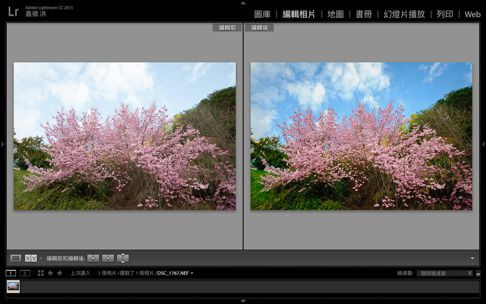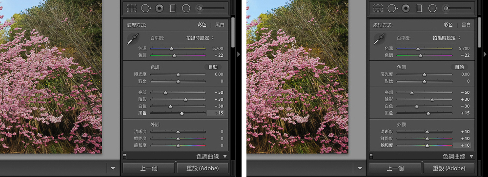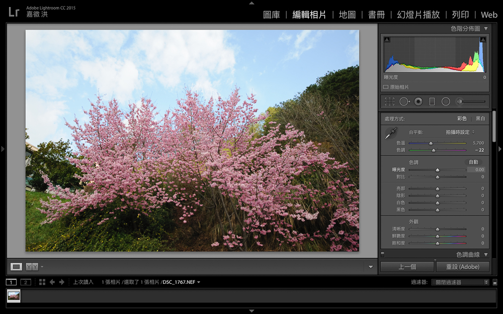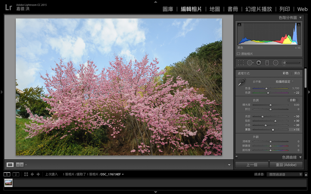 將RAW檔讀入Lightroom CC後,可以將照片分為三大部分,第一是亮暗細節、其次是色彩表現,最後是藍天、綠地、櫻花部分,只要針對以上三大部分進行編修強化,就能簡單提升照片的質感與豐富度。