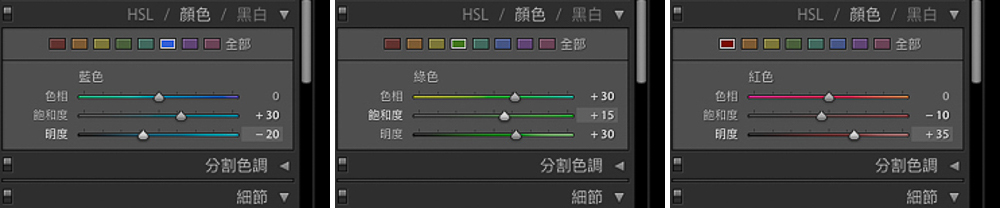 最後,針對藍天、綠地、櫻花這三大主體,開始加強色彩,一樣在Lightroom CC右邊窗格找到「HSL/顏色/黑白」功能,接著分別調整藍色(藍天)、綠色(綠色)、紅色(櫻花)的色相、飽和度與明度。