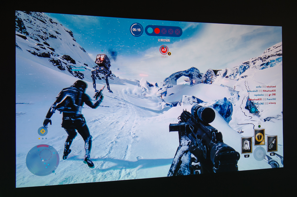 實際用相機側拍Optoma HD200D投影出來的顯示效果,可觀察遊戲中亮部雪地和暗部槍枝細節,顯示色彩、對比、紋路三者表現都非常優異,加上士兵奔跑時的動態特效,以及大尺寸投影效果,令人頗有身歷其境的感受。