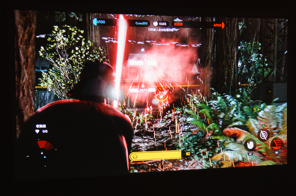 由於Optoma HD200D投影機本體,已有內建10W高音質揚聲器,不需準備外接喇叭也可以享受刺激音效。以筆者的單人房來說,揚聲器輸出大約調整在3到5階,音量效果就很足夠,遊戲中光劍音效「霹啪」、「嗡嗡」都十分清晰立體。
