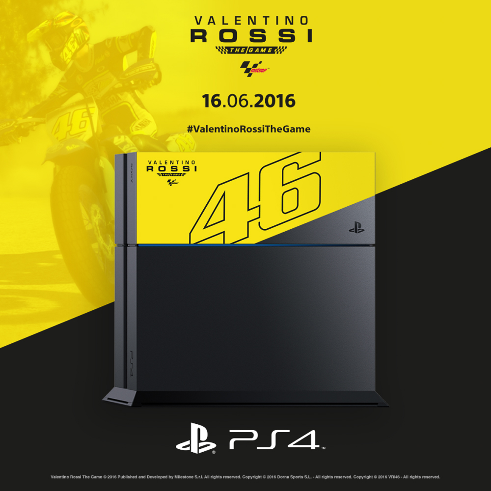除了羅西版PS4遊戲主機遊戲同梱版,Sony還將發售官方授權遊戲Valentino Rossi The Game限量套組,內附PS4藍光遊戲光碟、官方書籍、下載內容DLC兌換碼、VR46選手帽、旗幟、手環,以及兩張A2尺寸海報,建議售價為119.99歐元。