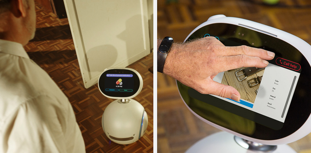 智慧型機器人Zenbo主要透過面部大型觸控螢幕,表達模擬出來的人工智能情緒,還可以顯示各項資訊,例如食譜、網購、朗讀、拍照.....等功能,是更為簡單直覺的人機互動介面。除了擔任數位管家外,透過智能穿戴裝置,智慧型機器人Zenbo也能發揮家庭照護基本功能,當家中長輩跌倒或者身體不適,會自動撥打指定電話號碼,並同步連結視訊影像,主動提醒其他家人。