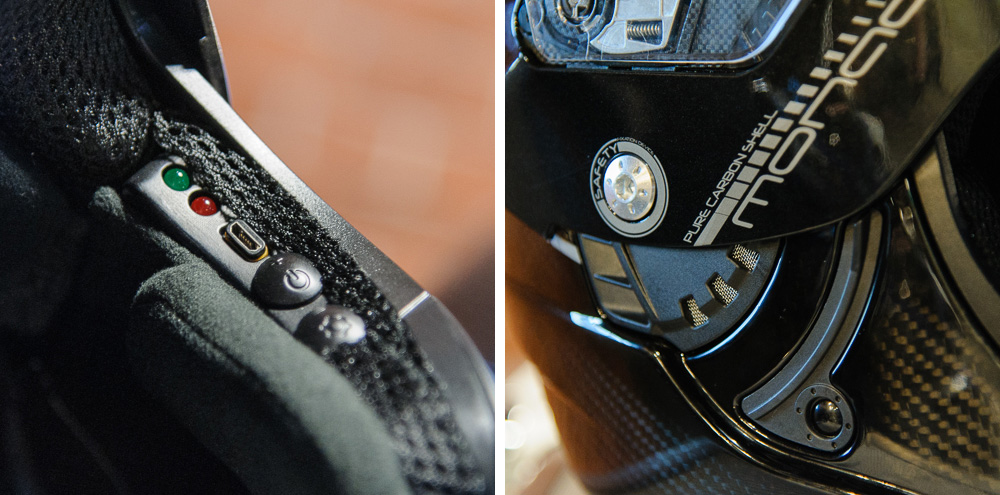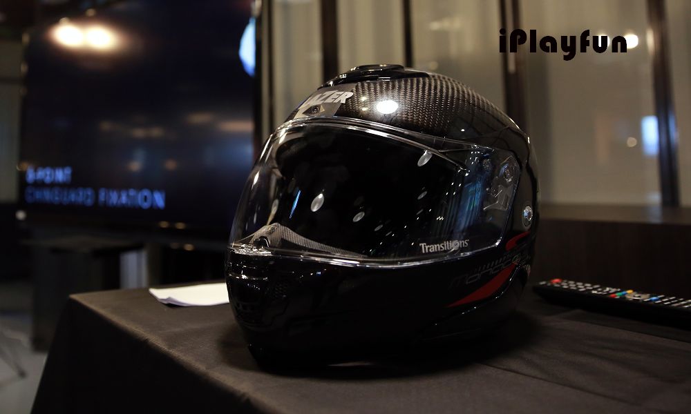 Monaco Evo S 採用航太級碳纖維打造全罩可掀式智慧安全帽,並配備法國鏡片大廠依視路「Transitions Lumino 變色遮風鏡片」。透過三點式通風、多道冷卻風路,以及通風鎖扣等縝密設計下,使新鮮的空氣能在頭頂與臉部自在流動,持續把熱氣從安全帽中排出。