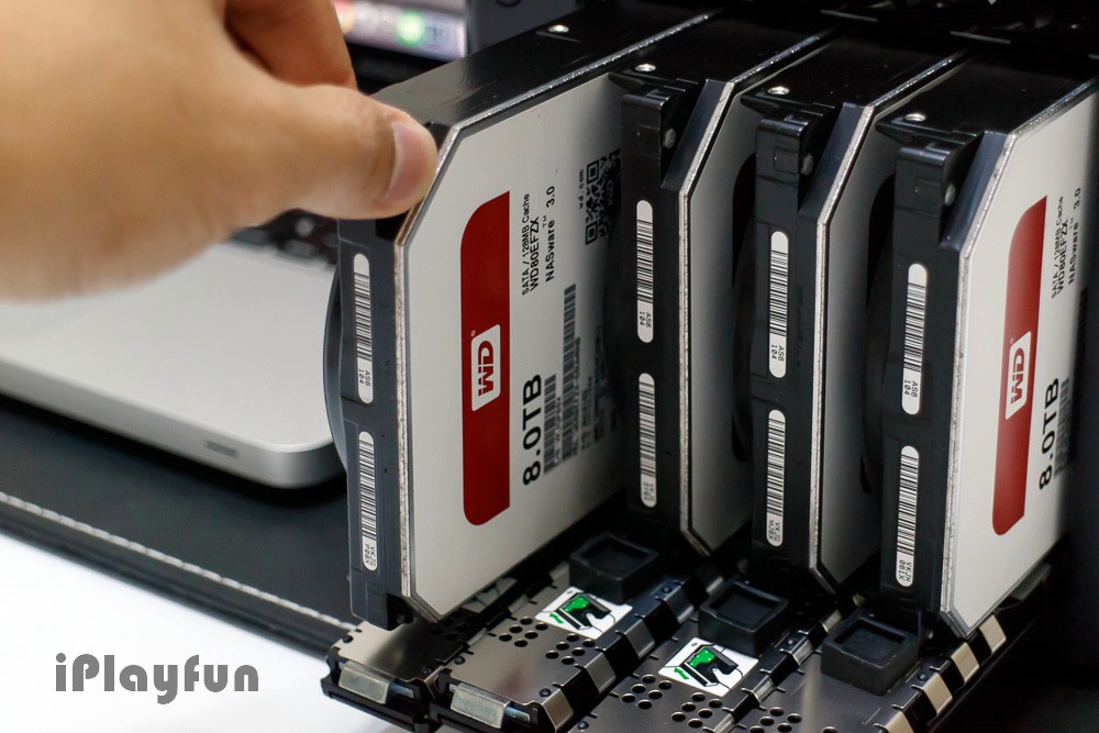 ►首先,將My Cloud Pro PR4100磁碟機槽門拉開,以便安裝四顆3.5吋的WD RED 8TB紅標NAS專用磁碟。