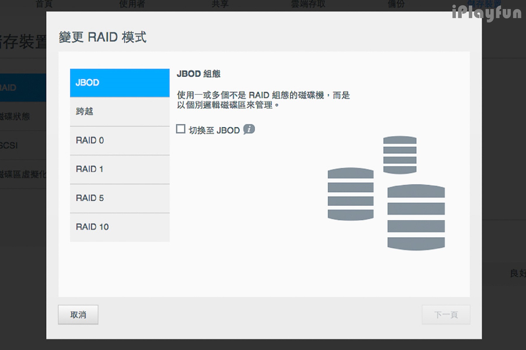 JBOD:將四顆磁碟個別分開存放管理,是最傳統保守的方式。(可用空間約32TB)