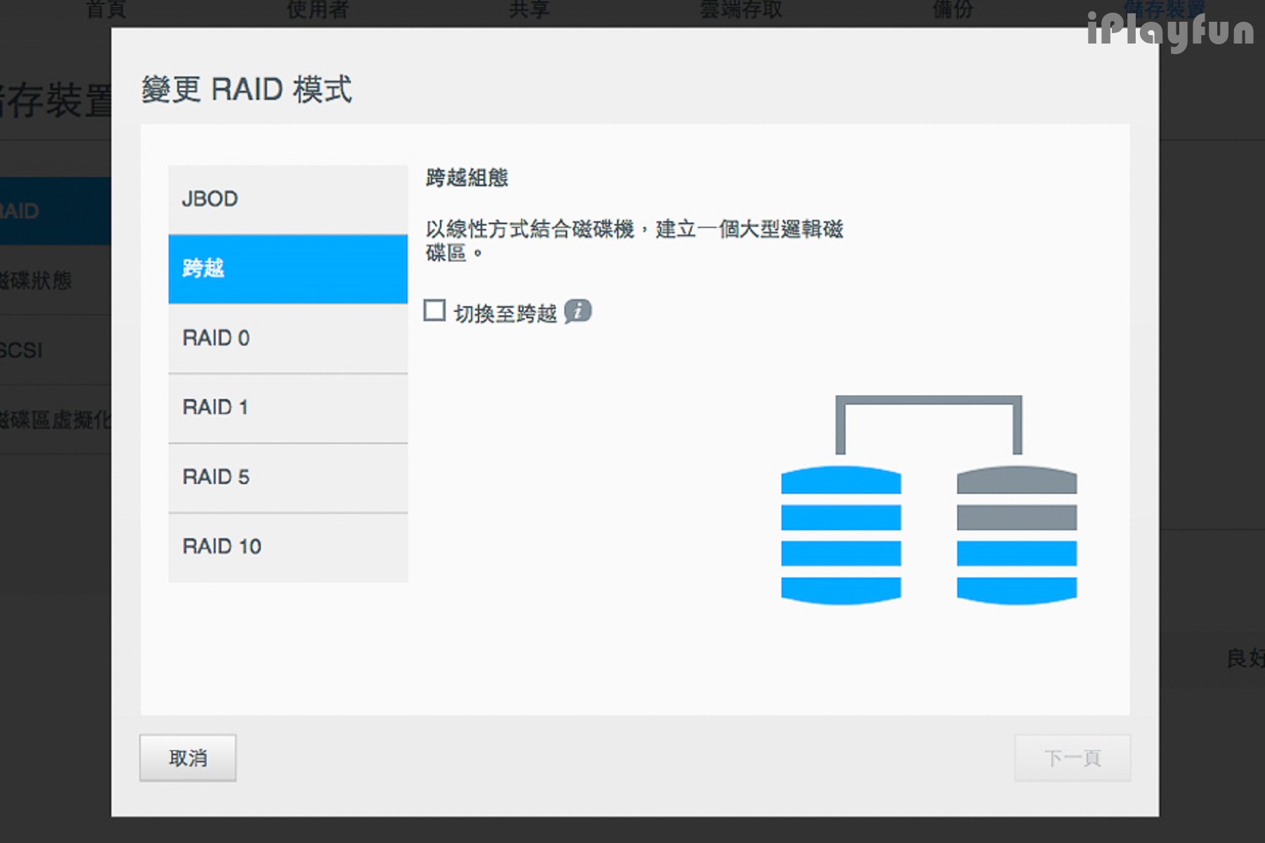 ►跨越:將四顆磁碟以線性串連在一起,成為單一磁碟,但不具備資料重建功用。(可用空間約32TB)