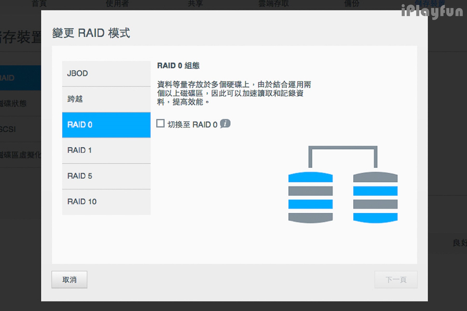 ►RAID 0磁碟陣列:資料平均分散於四顆磁碟,大幅提高磁碟讀寫運作效能,但其中一顆硬碟故障便難以挽救,不具備資料重建特性。(可用空間約32TB)