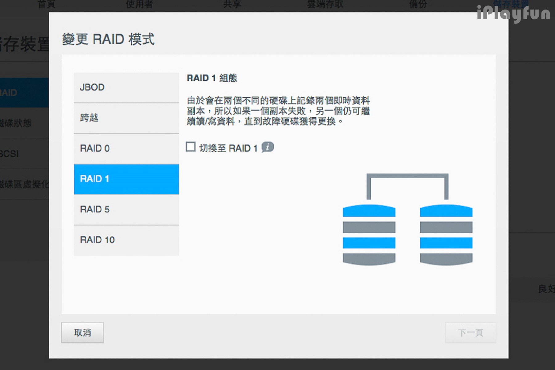►RAID 1磁碟陣列:資料以鏡射方式儲存於不同磁碟,具備資料重建特性,但實際可用容量最少,不推薦使用。(可用空間約8TB,兩顆磁碟閒置)