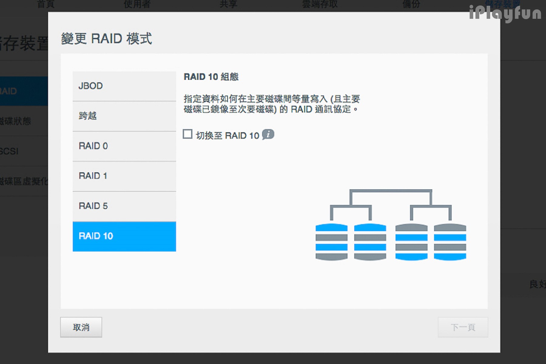 ►RAID 10磁碟陣列:適合四顆磁碟(含)以上使用的磁碟陣列模式,兼具高效能與高容錯特性,但實際可用儲存空間只有總量的一半。(可用空間約16TB)