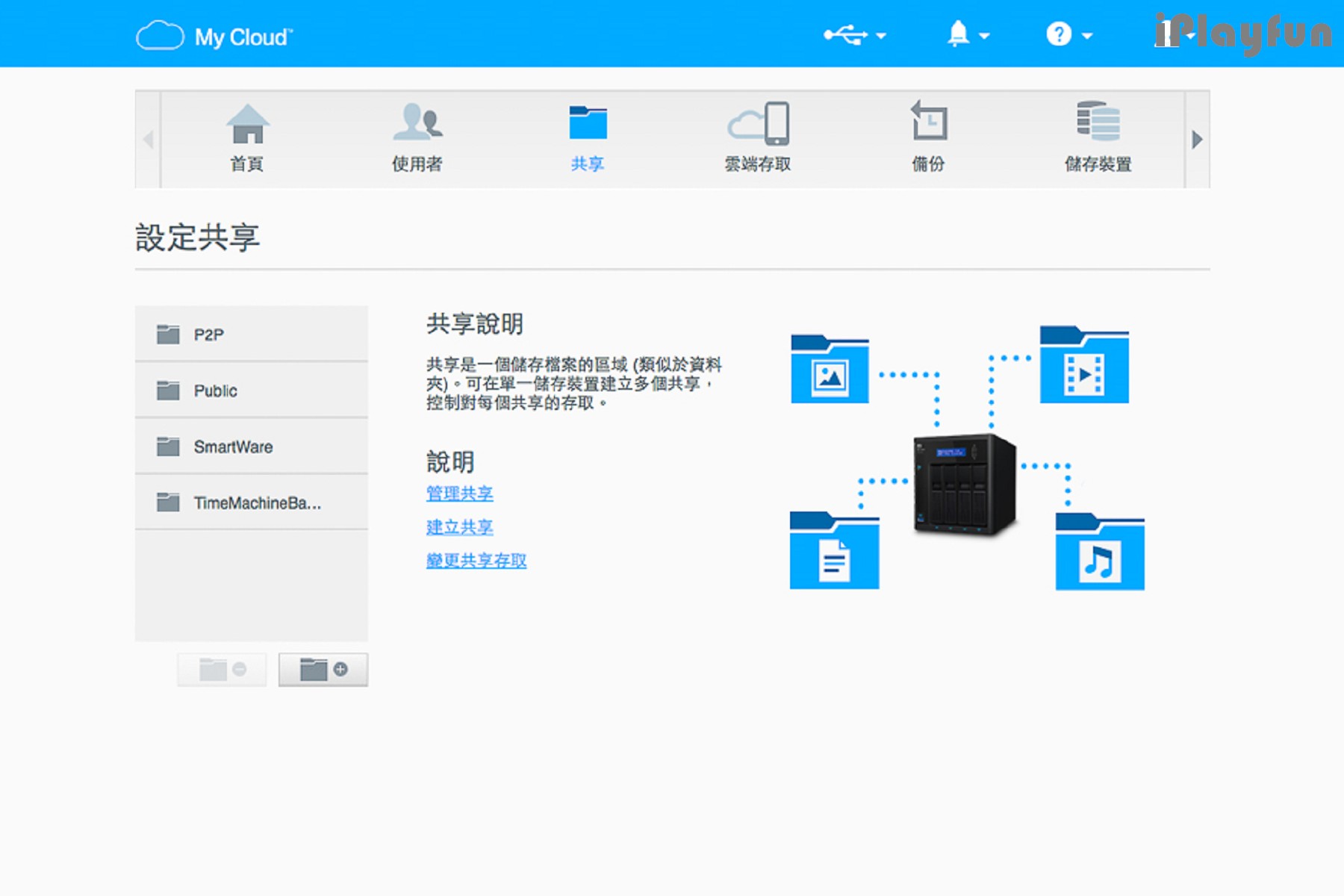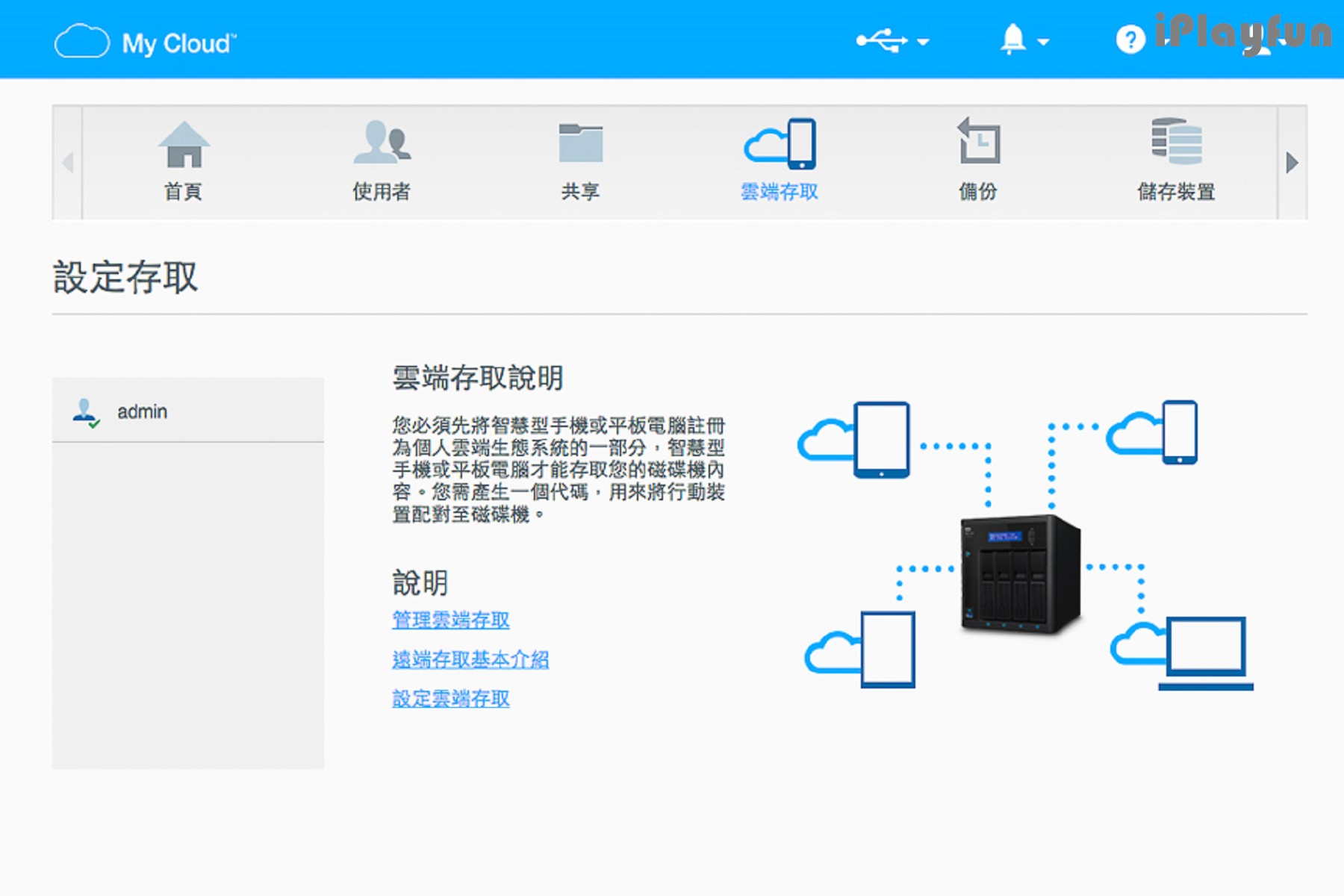►啟用雲端存取功能(需自行綁定帳號密碼),創造便利的私有雲環境,只要有暢通的網路環境,無論使用平板、筆電或智慧型手機,都能立即存取工作室或家中的My Cloud Pro PR4100檔案資料,同時兼顧機密與安全性。