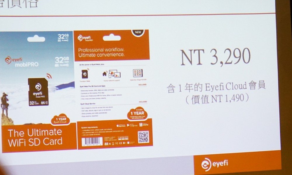 ►Eyefi Mobi Pro 32GB附贈1年無限制容量的Eyefi Cloud數位雲端服務,售價3,290元。