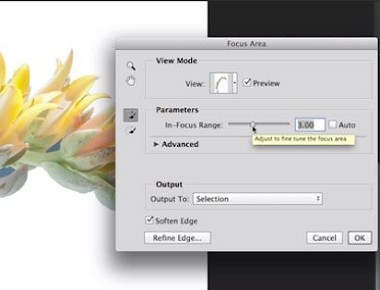 這個功能下,Photoshop 會協助使用者自動選取影像的對焦區域,建立遮色片快速抽換背景顏色,用來當作影像去背功能也很便利。而新功能的選取區域更為精準,微調的部分也有加強,對焦遮色片很適合於人像照片編修和淺景深的影像,新加入的Mercury Graphics Engine 也提供了更高速的效能。