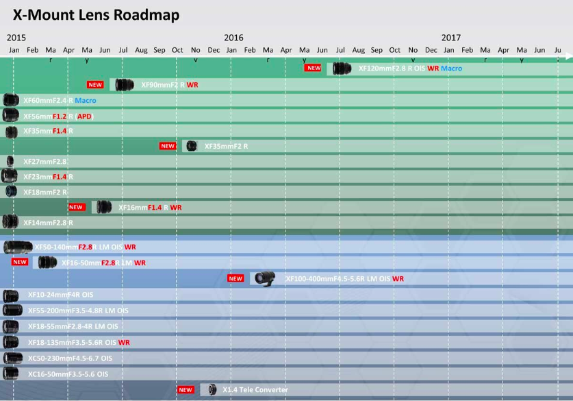 X-Pro2的出現眾說紛紜,富士各階產品線有許多更新,而旗艦級的X-Pro1下一代卻始終不知道何時會跟粉絲見面。根據外電消息,富士的產品時程圖透露,即將於今年下半年推出一系列的新鏡頭,包括定焦鏡與變焦鏡頭,詳細的時程表亦已在網上流傳出來,主要的包括: